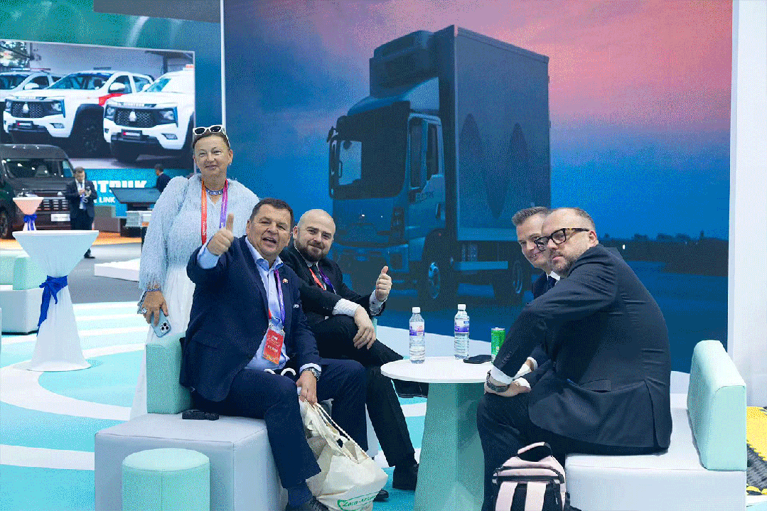 ??大會為榮獲2025年“最佳服務獎”“最佳營銷獎”“杰出貢獻獎”的合作伙伴頒獎,并贈送中國重汽搏勝皮卡S系列產品。以紅色和白色為主色調的皮卡獎品于展館入口區域整齊列隊,迅速吸引全球合作伙伴的駐足觀摩與連連稱贊。據統計,中國重汽共準備60余輛皮卡作為獎勵,彰顯中國重汽對優秀合作伙伴的重視與誠意。在產品推介環節,中國重汽重點推出新能源、物流車、工程車、輕型車四大領域的全場景解決方案,展現出全系列商用車的技術硬實力。